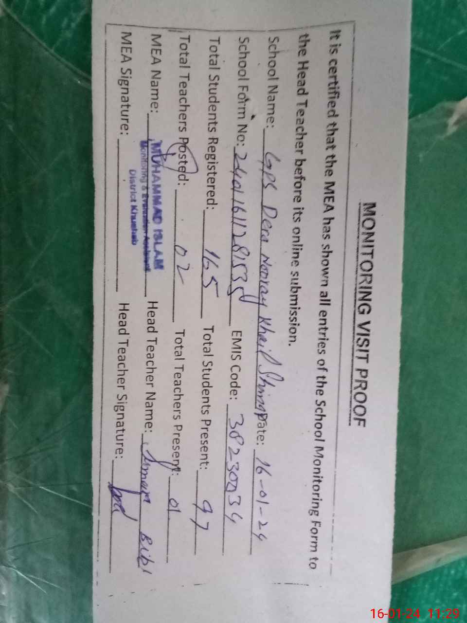 | Attendance Register | Head Teacher | MEA with School | Visit Proof |