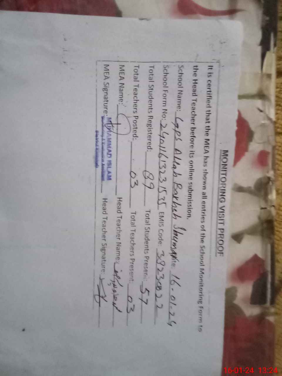 | EMIS Code: 38230022 | Name of School: GPS ALLAH BAKHSH SHUMAR | |||