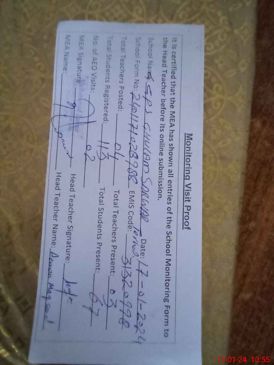 | Attendance Register | Head Teacher | MEA with School | Visit Proof |