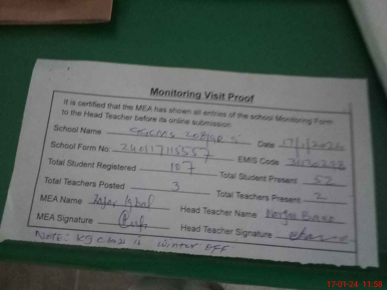 | Attendance Register | Head Teacher | MEA with School | Visit Proof |
