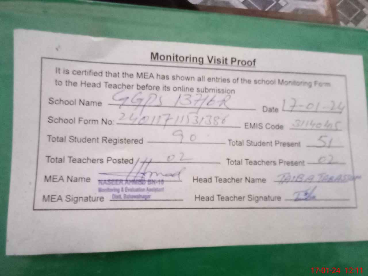 | Attendance Register | Head Teacher | MEA with School | Visit Proof |