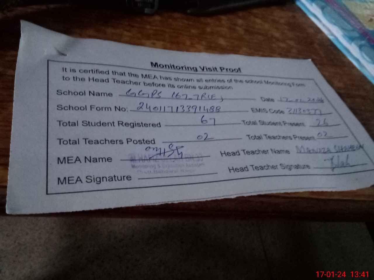 | EMIS Code: 31130377 | Name of School: GGPS CHAK NO 167/7-R E | |||