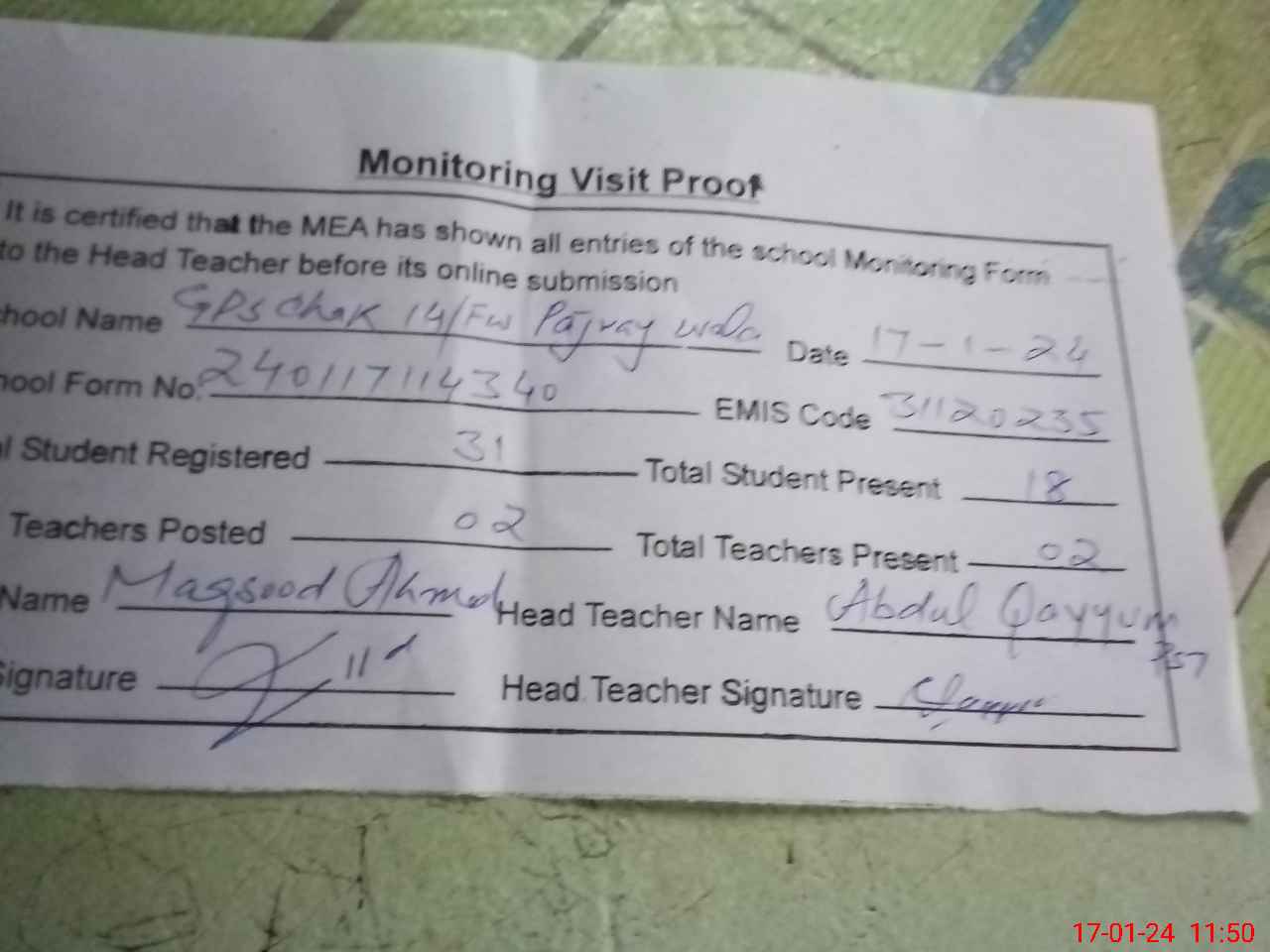 | Attendance Register | Head Teacher | MEA with School | Visit Proof |