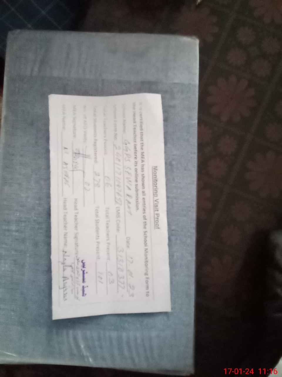 | Attendance Register | Head Teacher | MEA with School | Visit Proof |