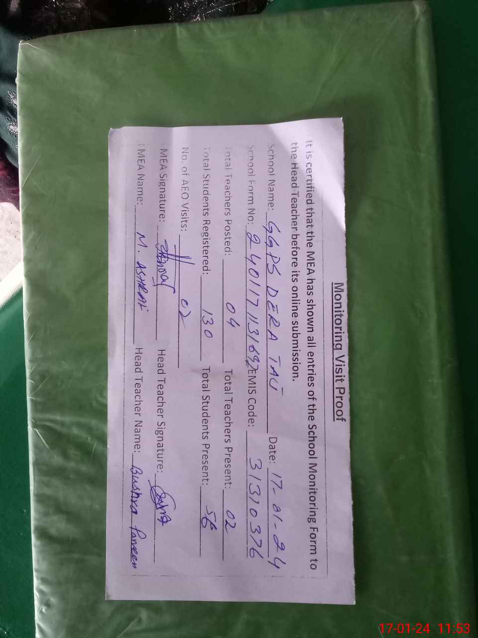 | Attendance Register | Head Teacher | MEA with School | Visit Proof |