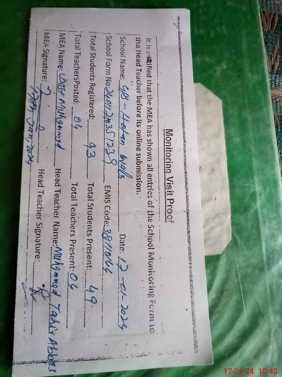 | Attendance Register | Head Teacher | MEA with School | Visit Proof |