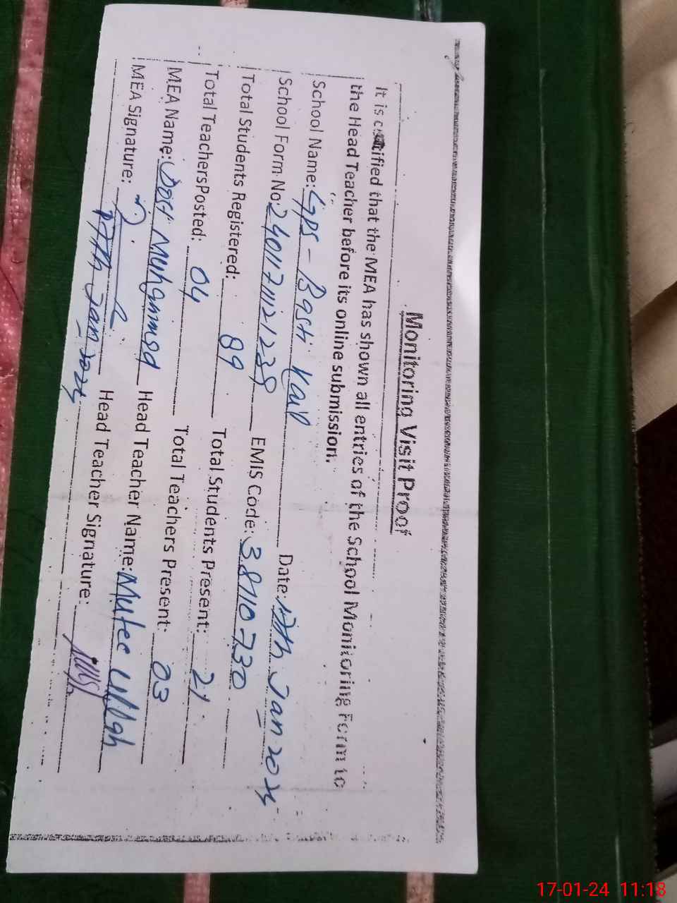| Attendance Register | Head Teacher | MEA with School | Visit Proof |