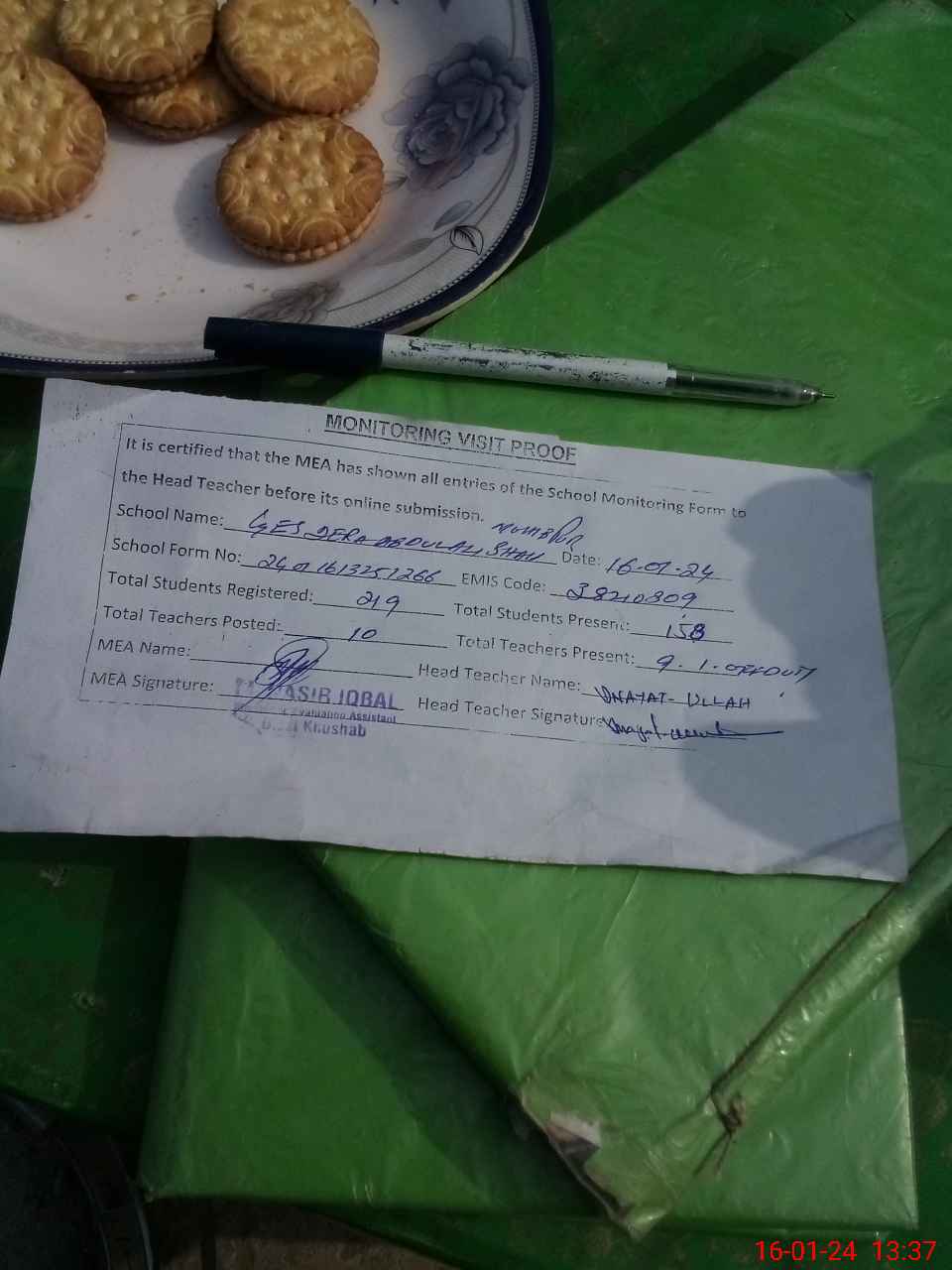| EMIS Code: 38210809 | Name of School: GES DERA ABDUL ALI SHAH MOHIB PUR | |||