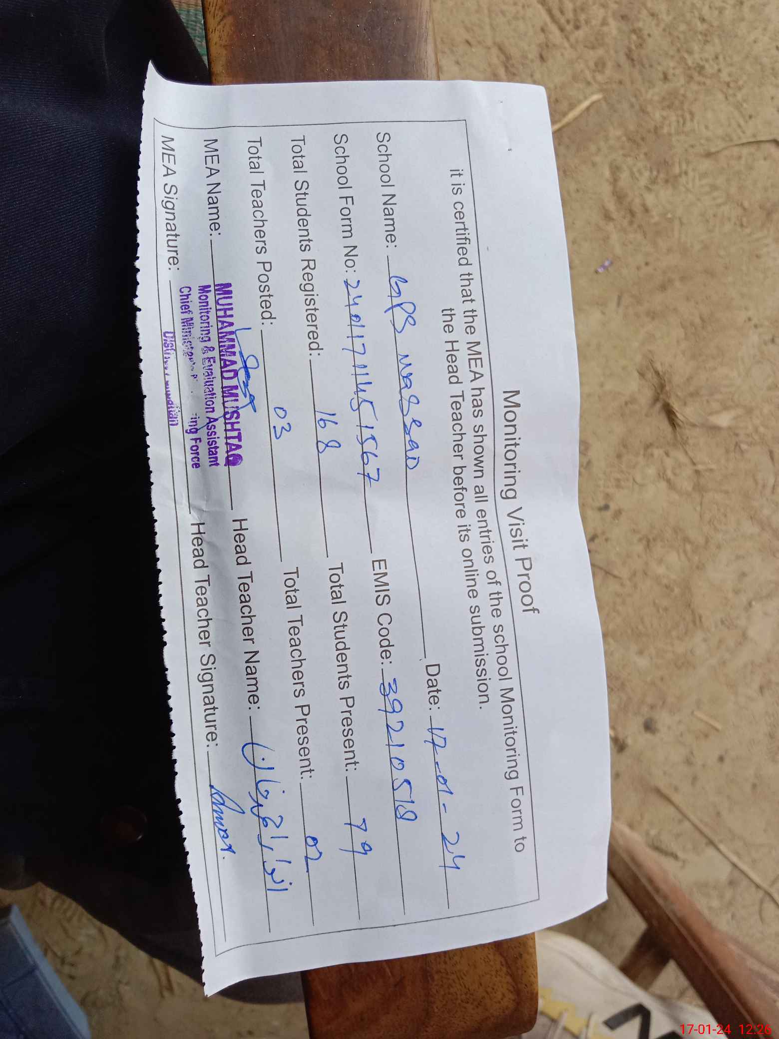 | Attendance Register | Head Teacher | MEA with School | Visit Proof |