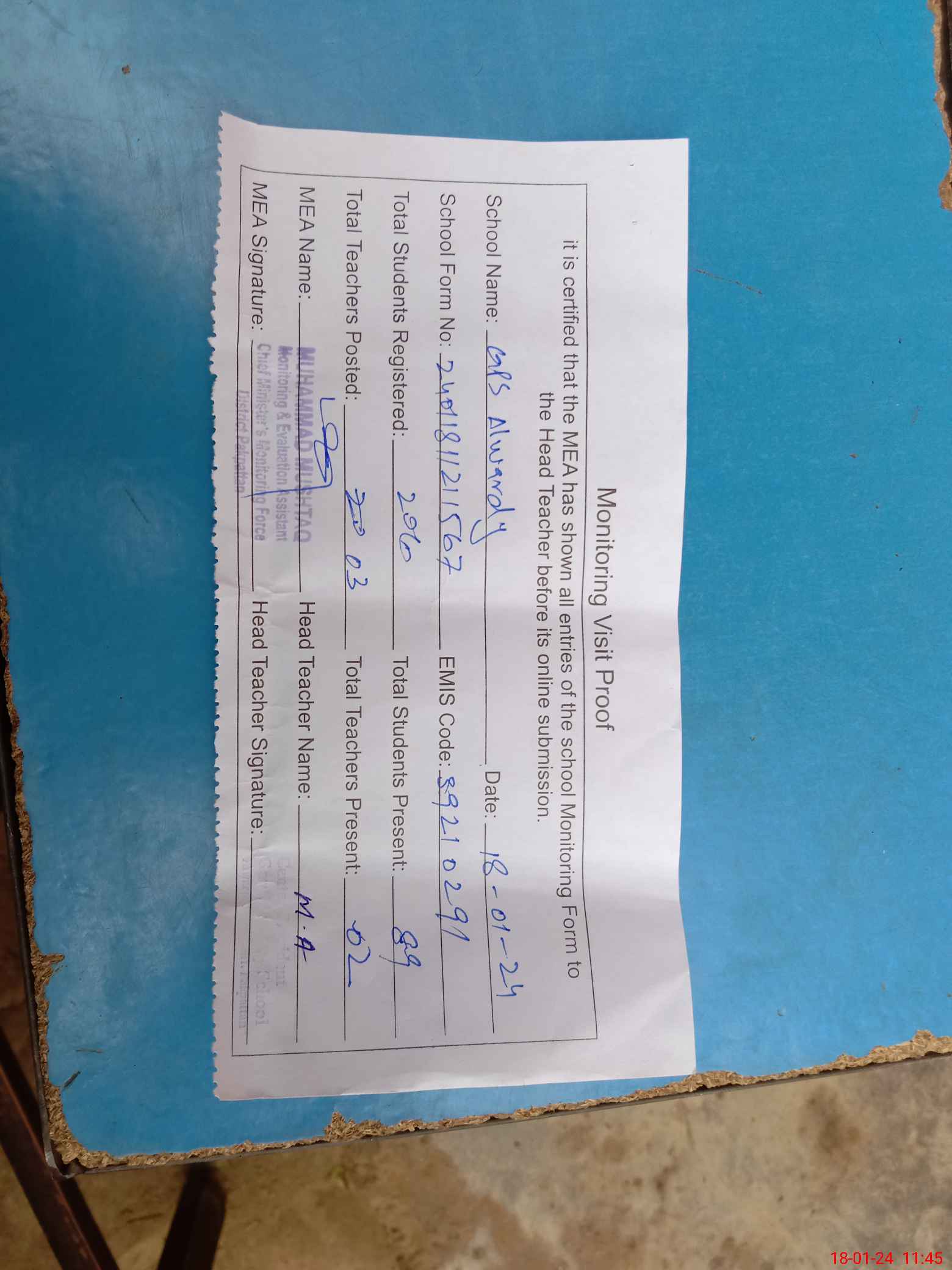 | Attendance Register | Head Teacher | MEA with School | Visit Proof |