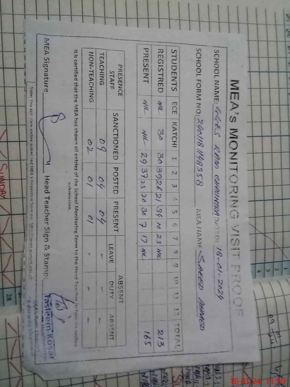 | Attendance Register | Head Teacher | MEA with School | Visit Proof |