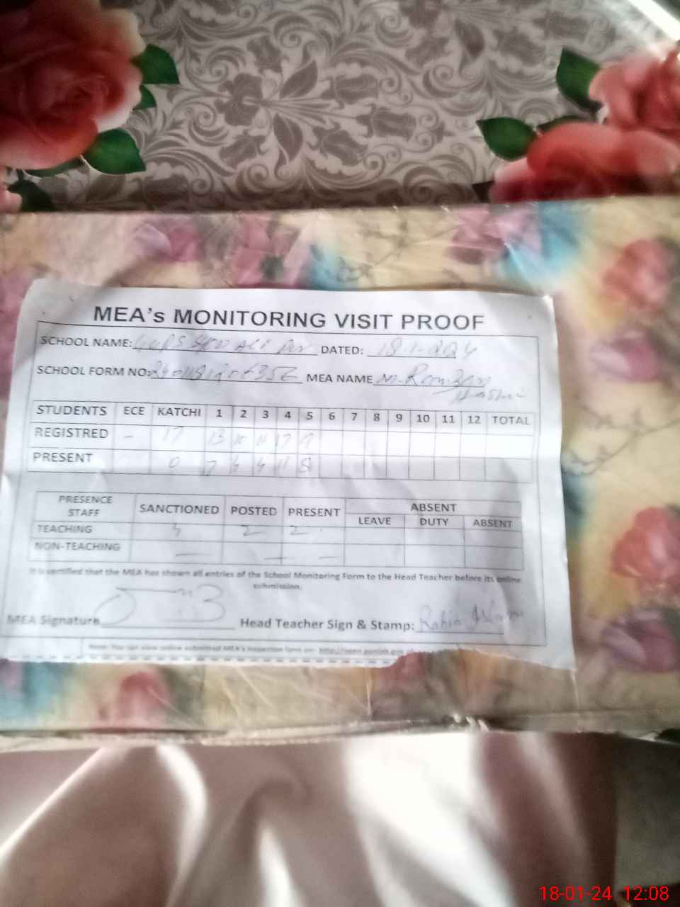 | Attendance Register | Head Teacher | MEA with School | Visit Proof |