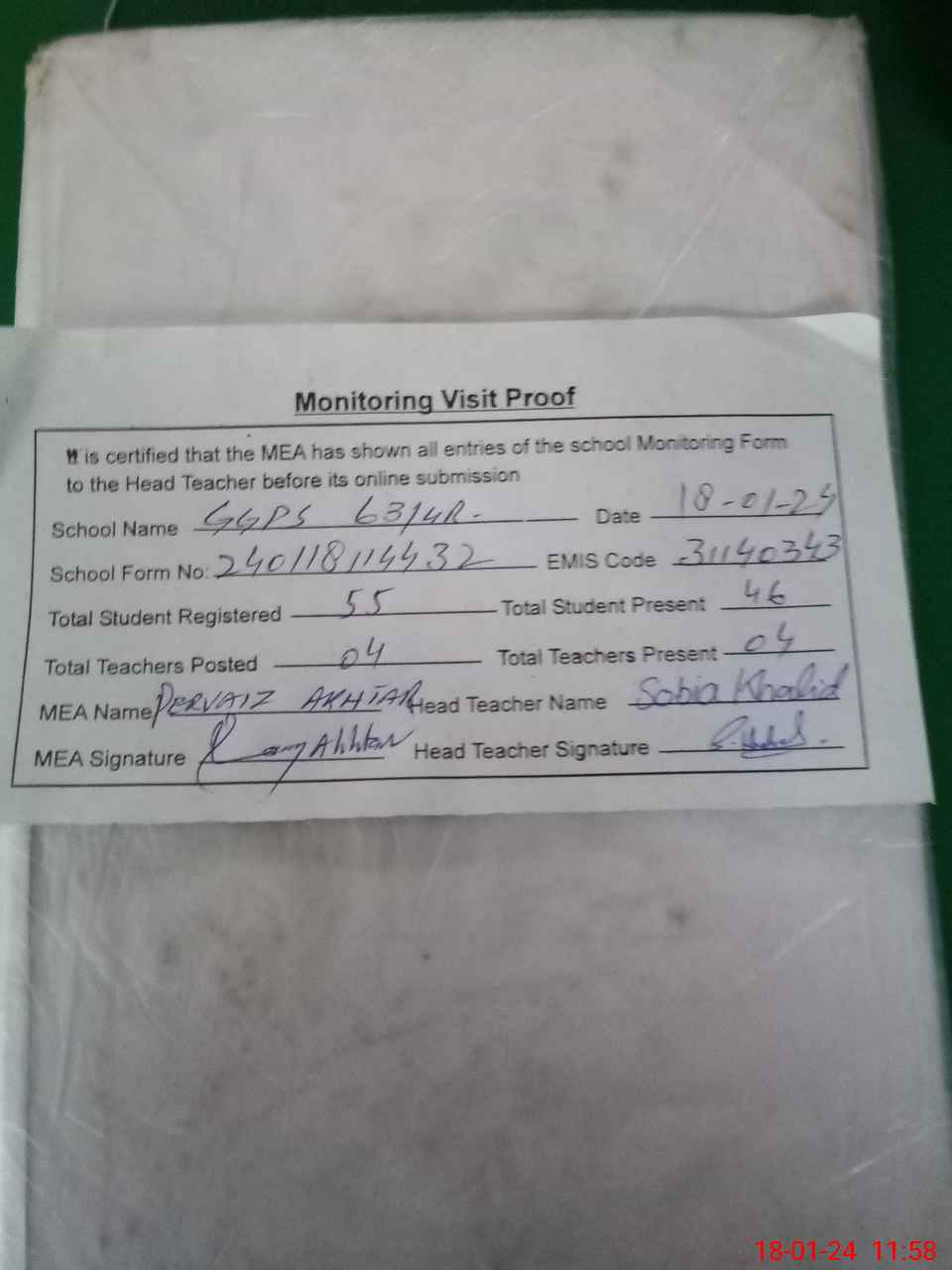 | Attendance Register | Head Teacher | MEA with School | Visit Proof |