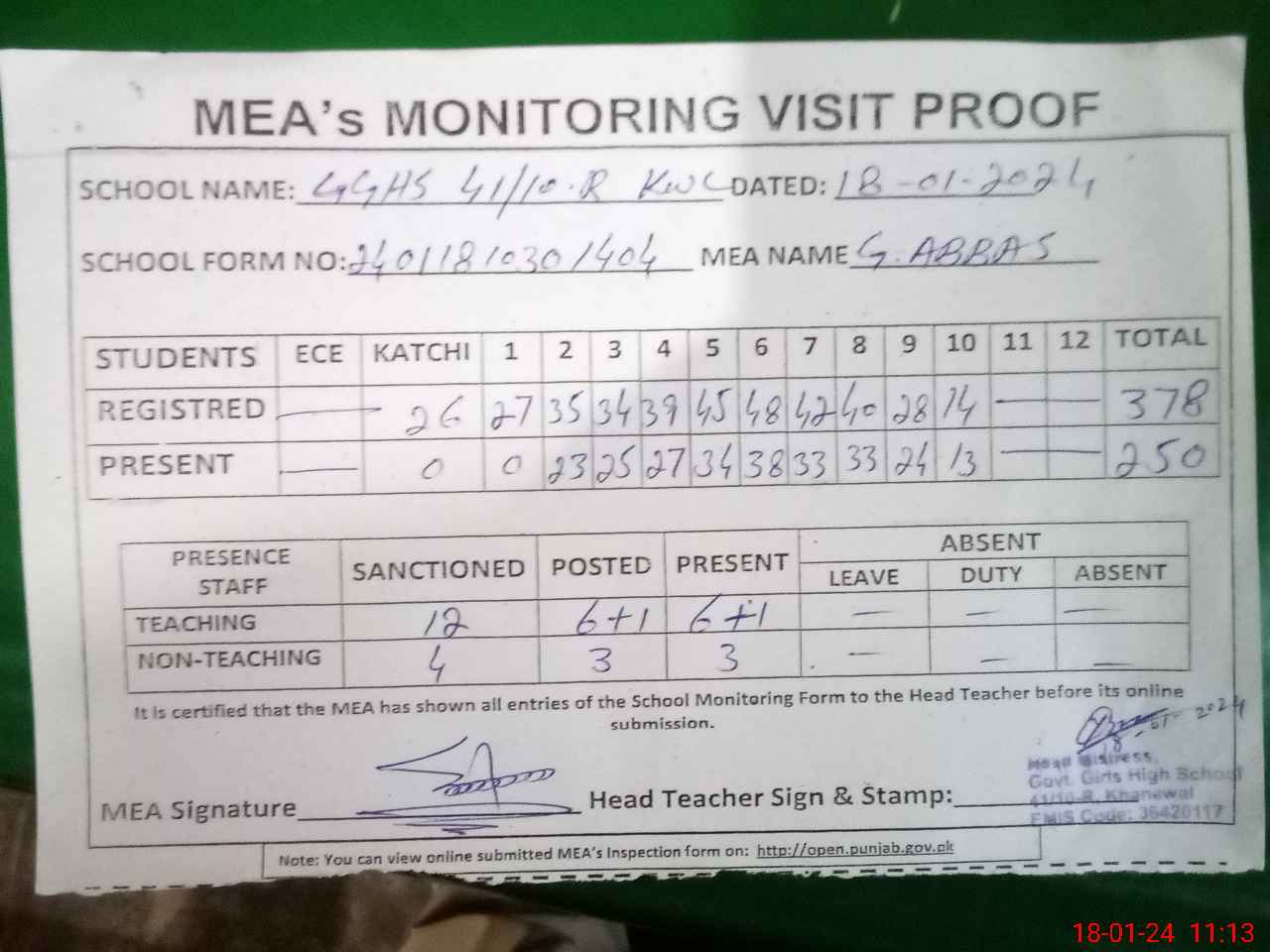| Attendance Register | Head Teacher | MEA with School | Visit Proof |