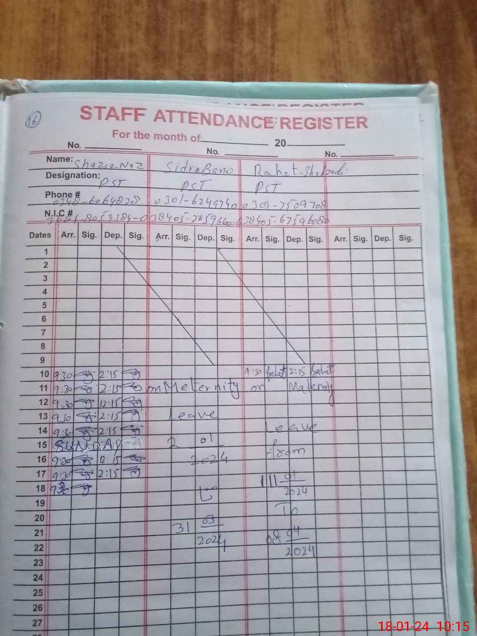 | CNIC | Full Name | Designation | R/C | Absence During Last Calender Month |
