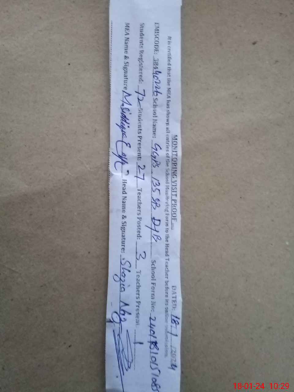 | Attendance Register | Head Teacher | MEA with School | Visit Proof |