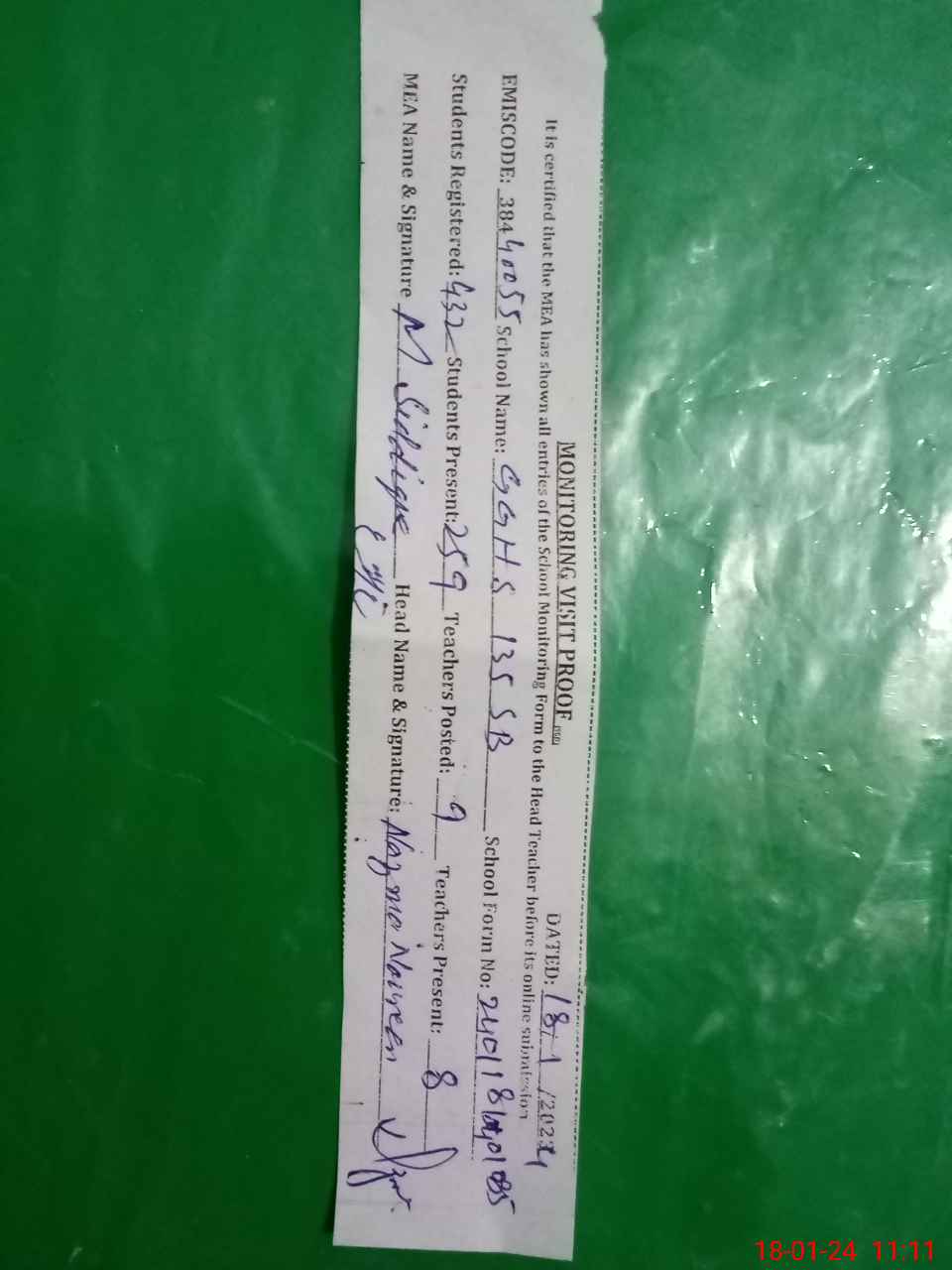 | Certified that this School was Inspected by the Undersigned MEA/DMO Today and the Information Stated Above is as Per Record. | |||||