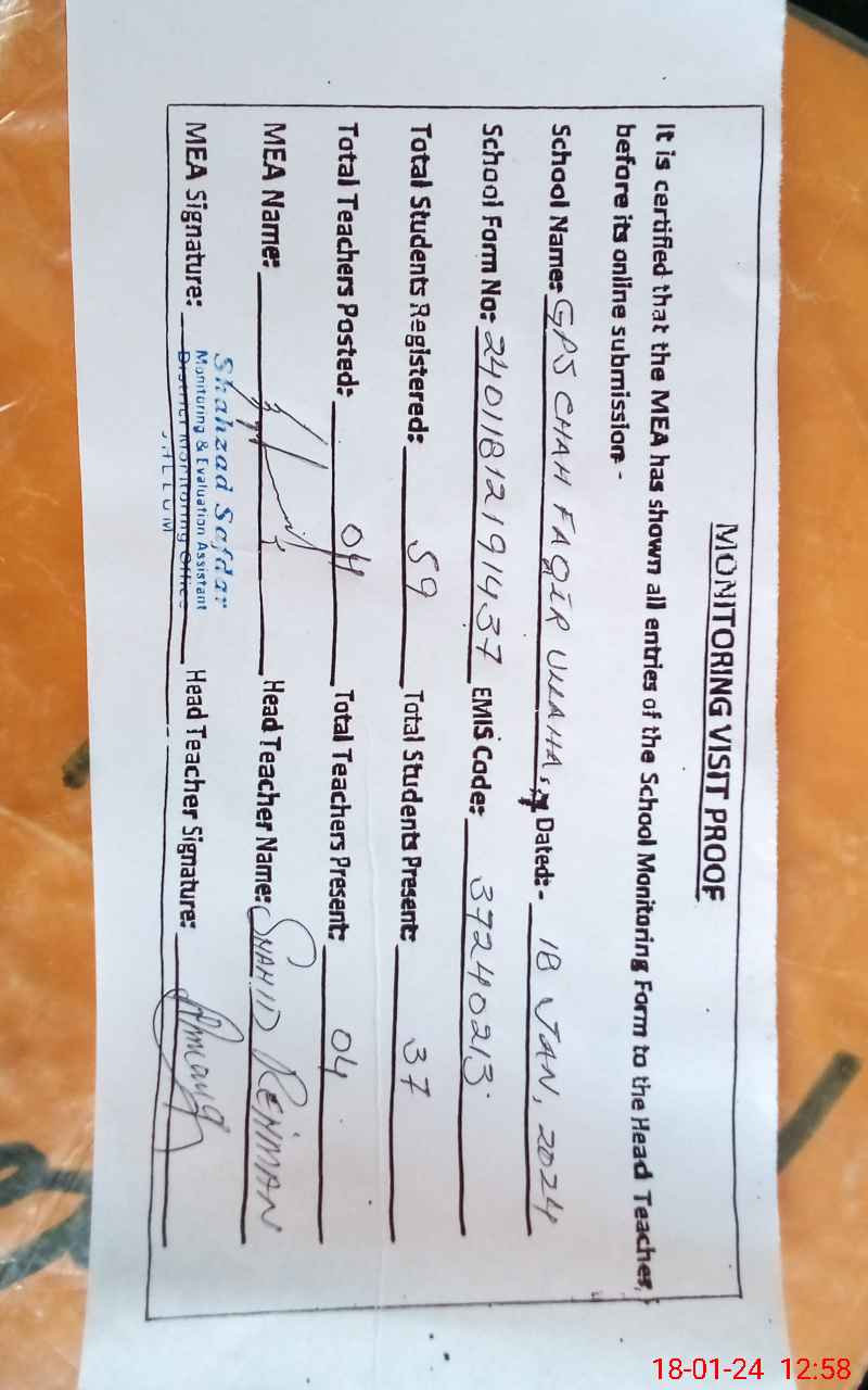 | EMIS Code: 37240213 | Name of School: GPS CHAH FAQIR ULLAHA | |||