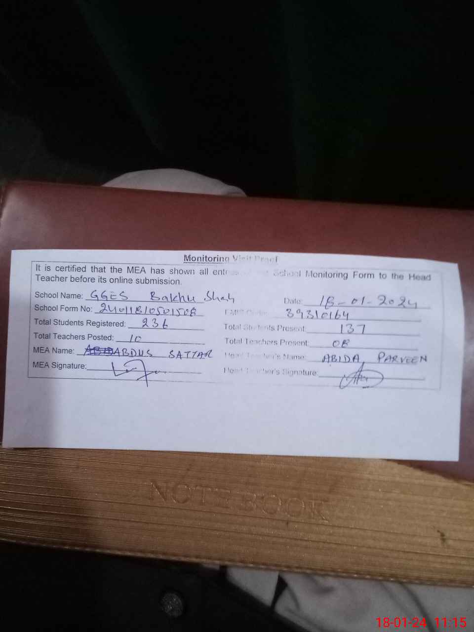| Attendance Register | Head Teacher | MEA with School | Visit Proof |
