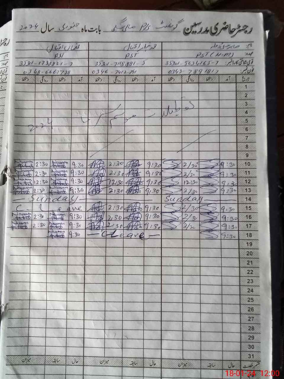 | CNIC | Full Name | Designation | R/C | Absence During Last Calender Month |