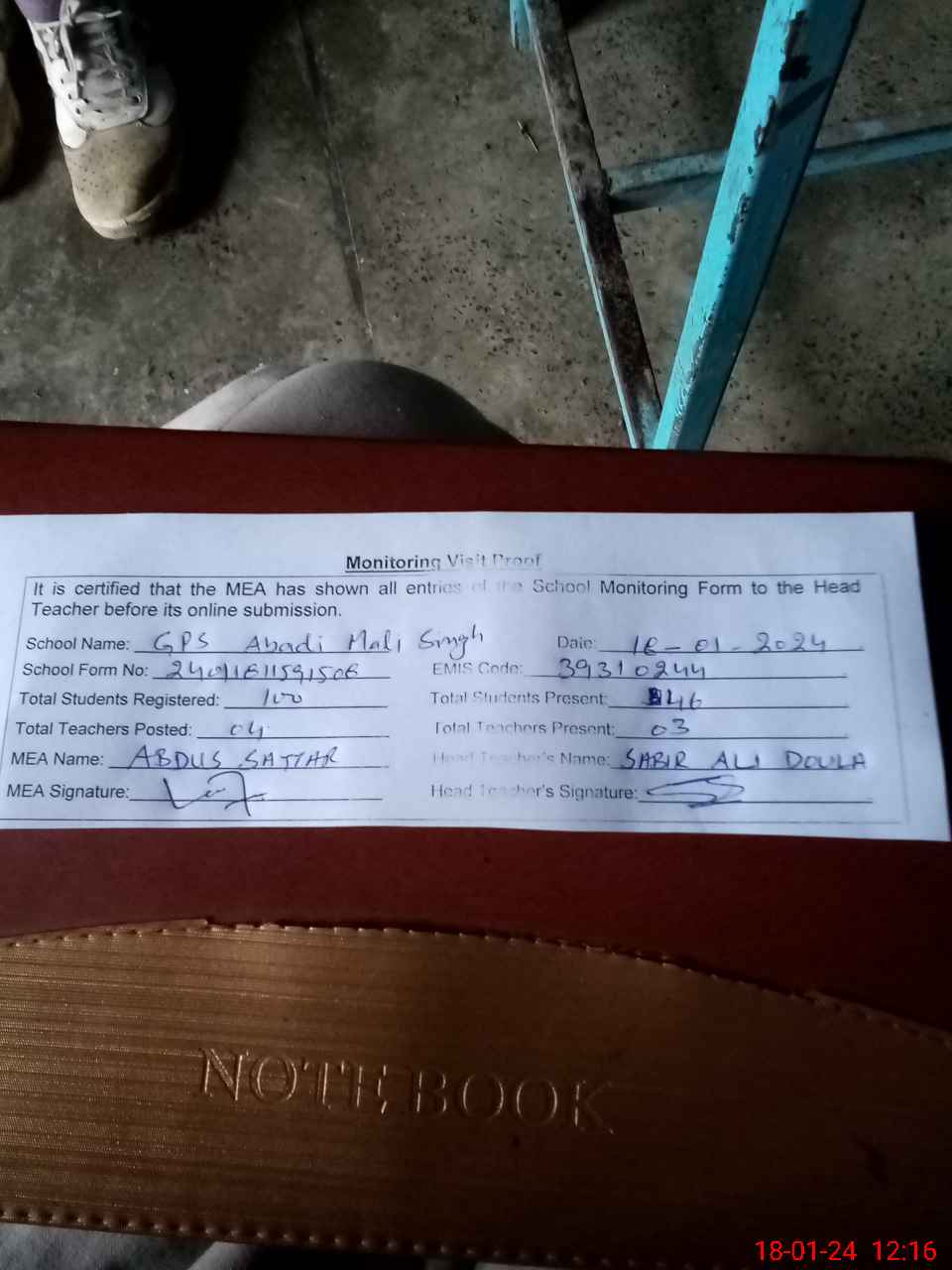 | Attendance Register | Head Teacher | MEA with School | Visit Proof |