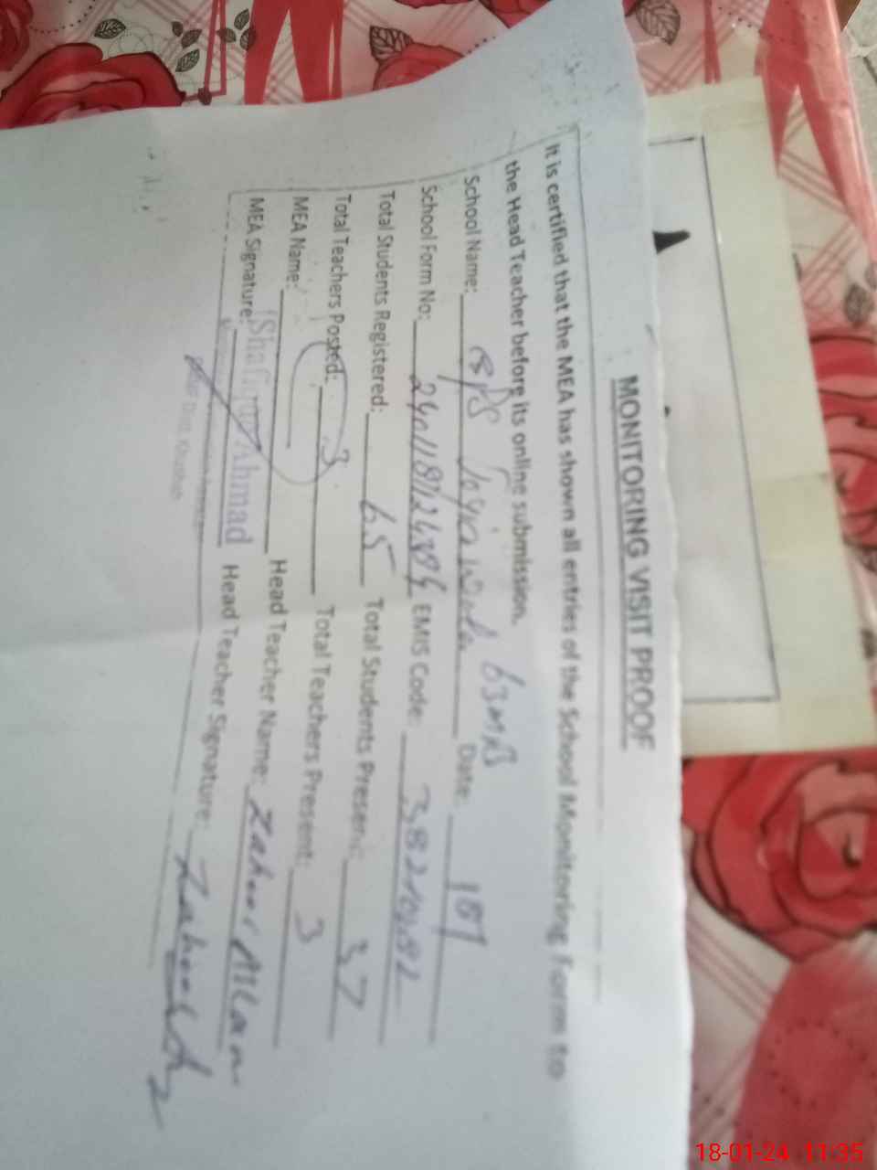 | Attendance Register | Head Teacher | MEA with School | Visit Proof |