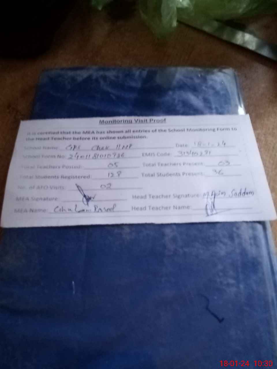 | Attendance Register | Head Teacher | MEA with School | Visit Proof |
