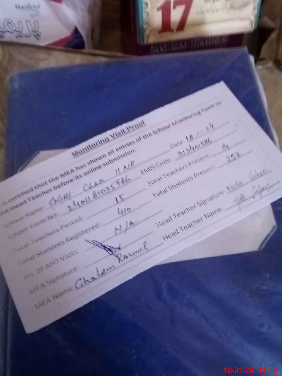 | Attendance Register | Head Teacher | MEA with School | Visit Proof |