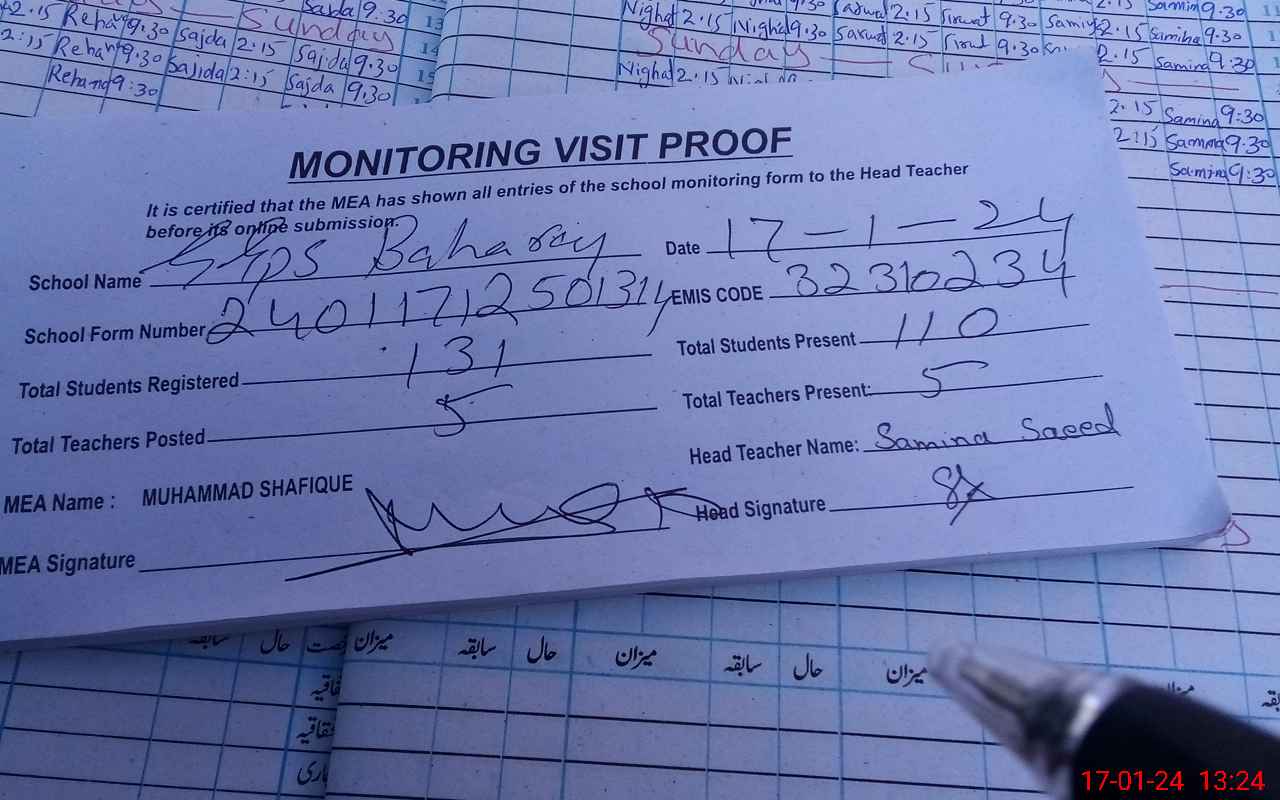 | Attendance Register | Head Teacher | MEA with School | Visit Proof |