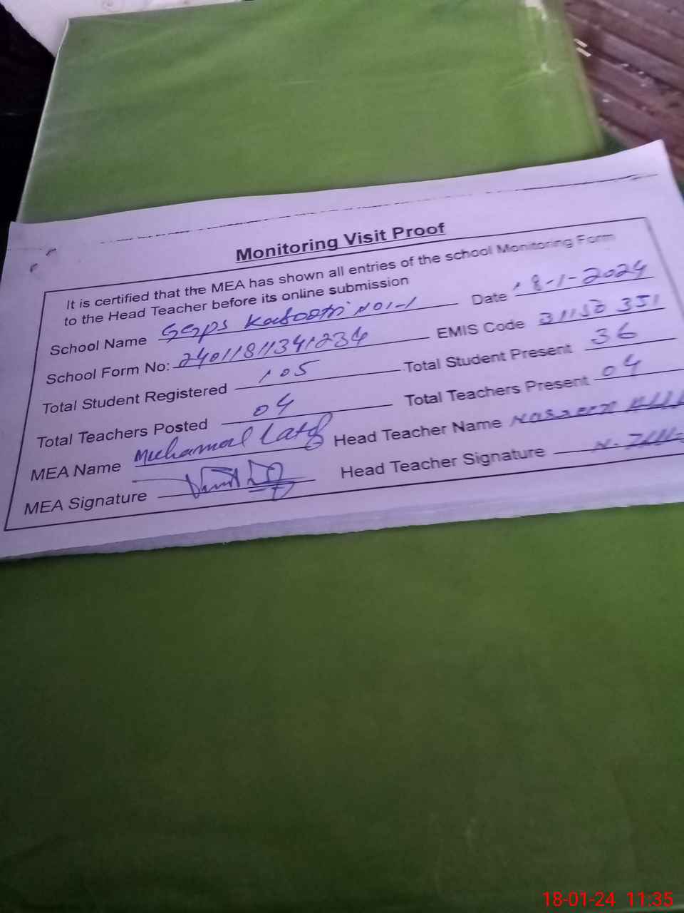 | Attendance Register | Head Teacher | MEA with School | Visit Proof |