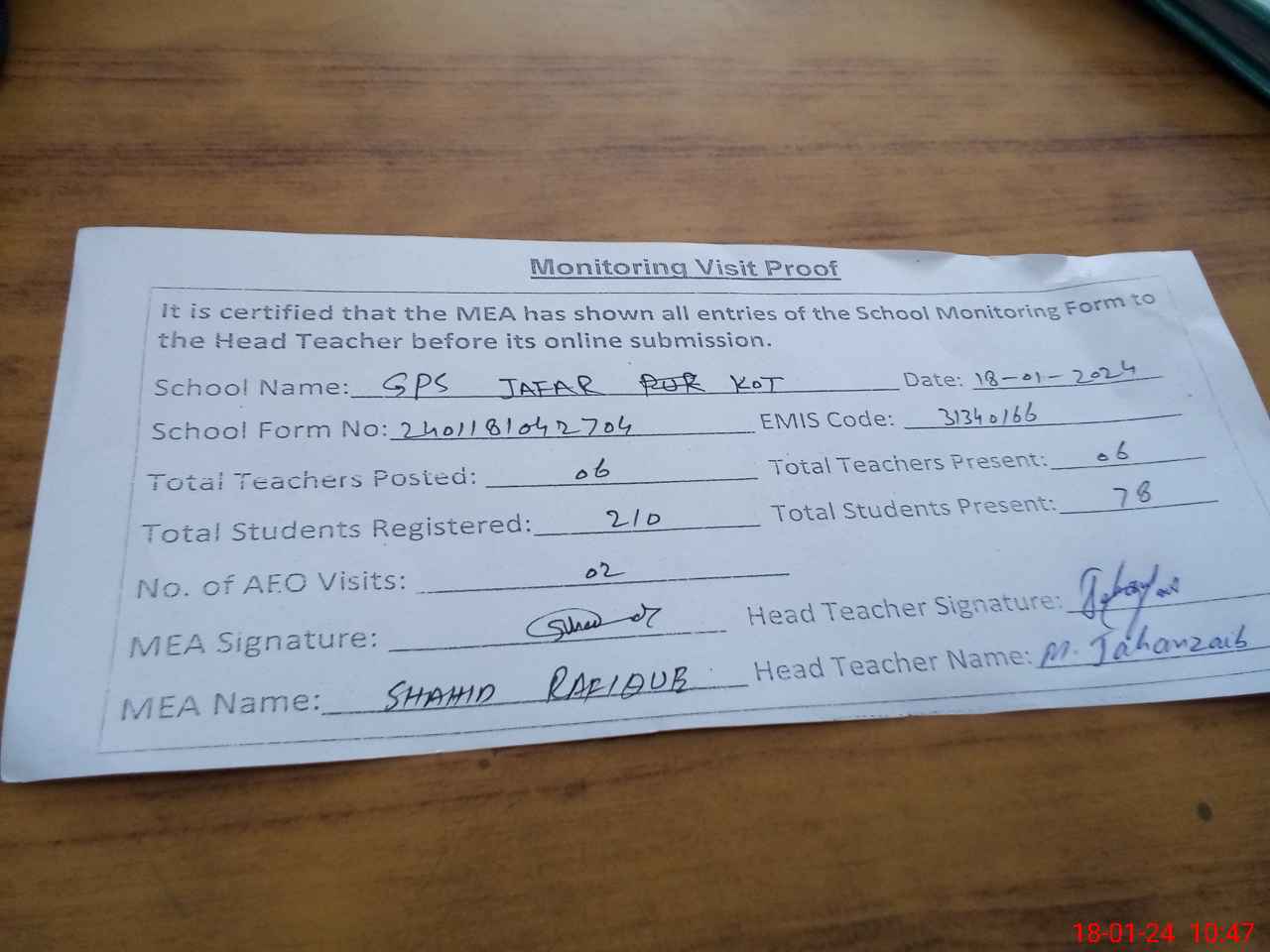| Attendance Register | Head Teacher | MEA with School | Visit Proof |