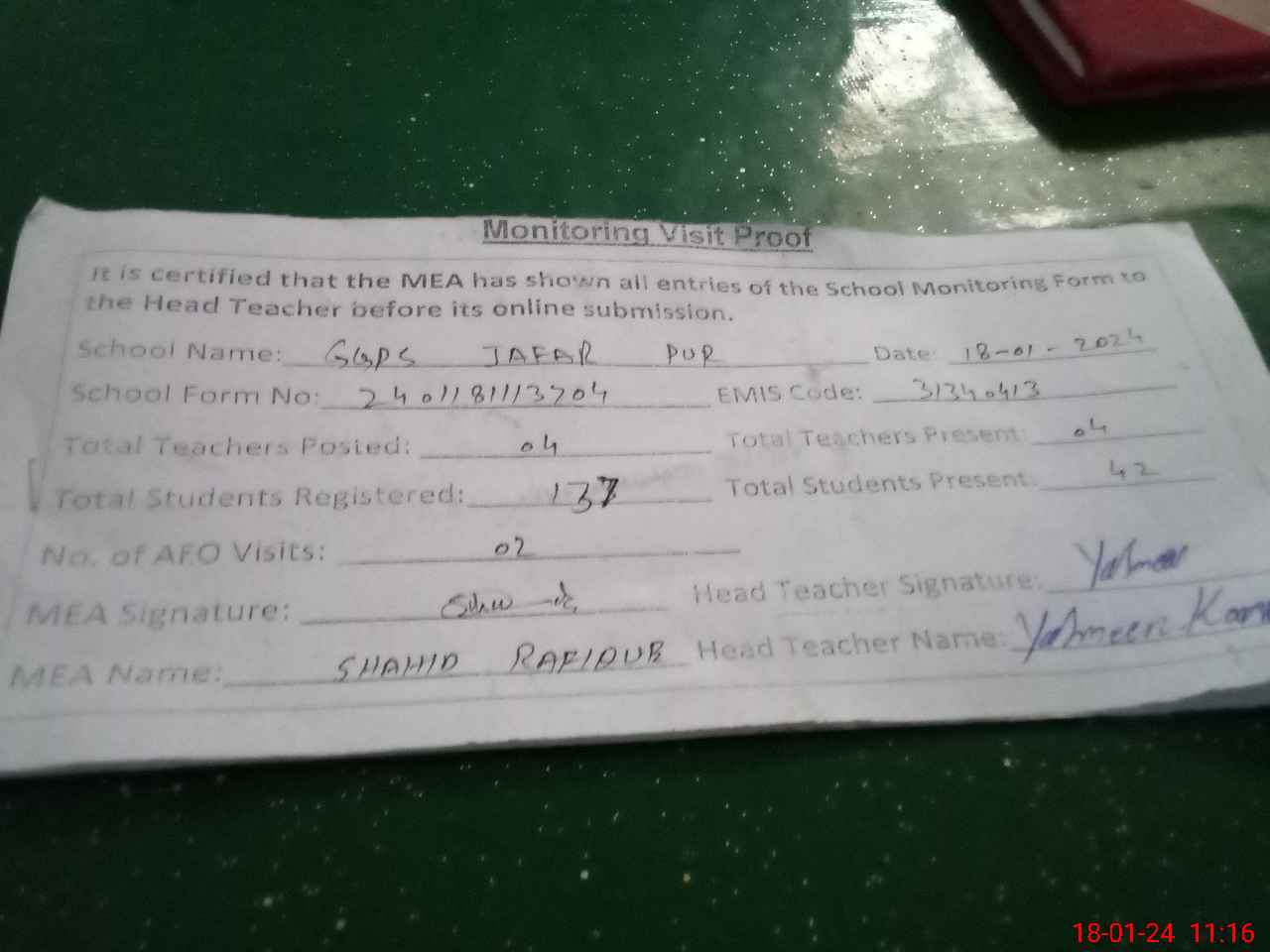 | Attendance Register | Head Teacher | MEA with School | Visit Proof |
