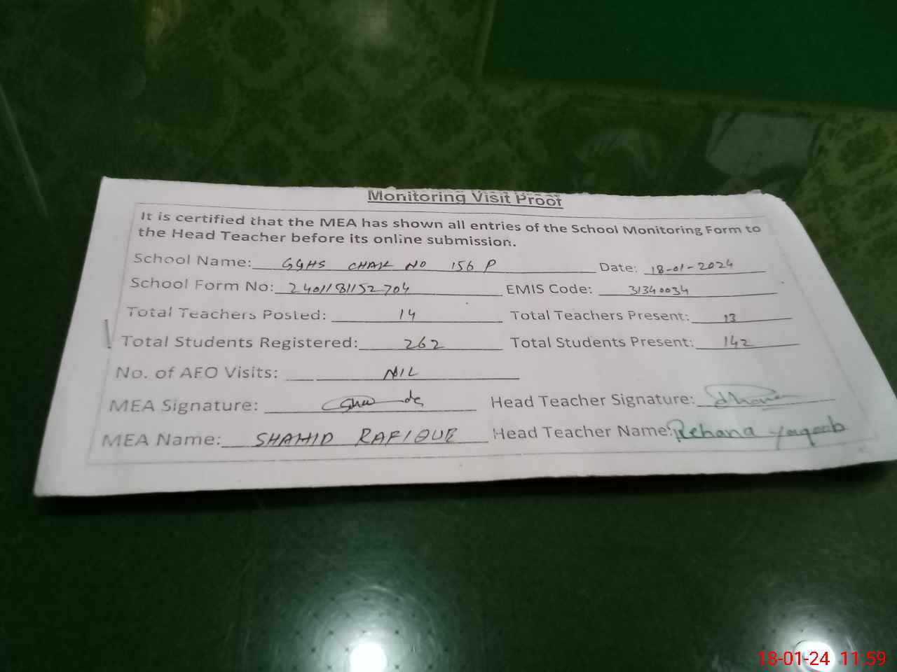 | Attendance Register | Head Teacher | MEA with School | Visit Proof |