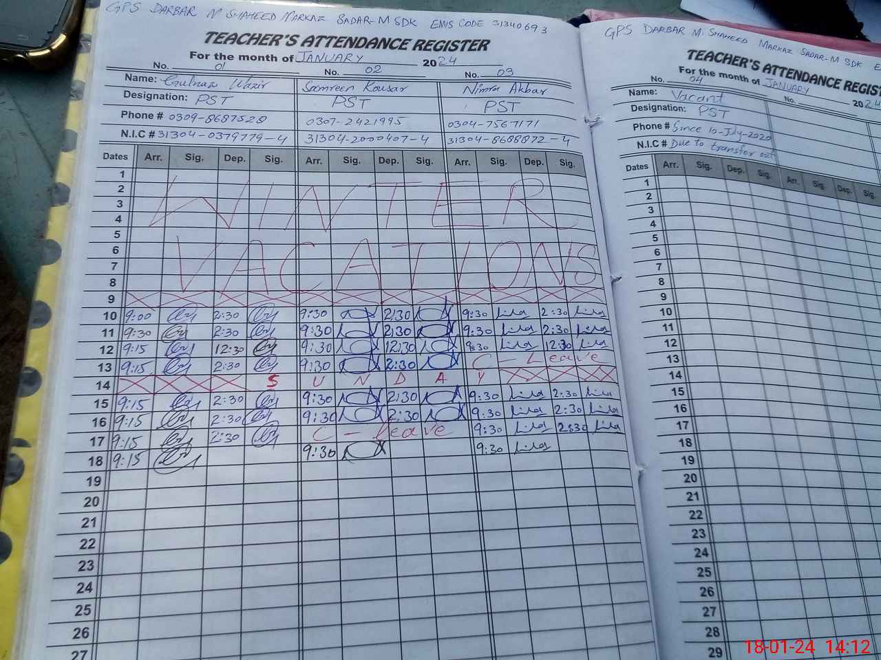 | CNIC | Full Name | Designation | R/C | Absence During Last Calender Month |