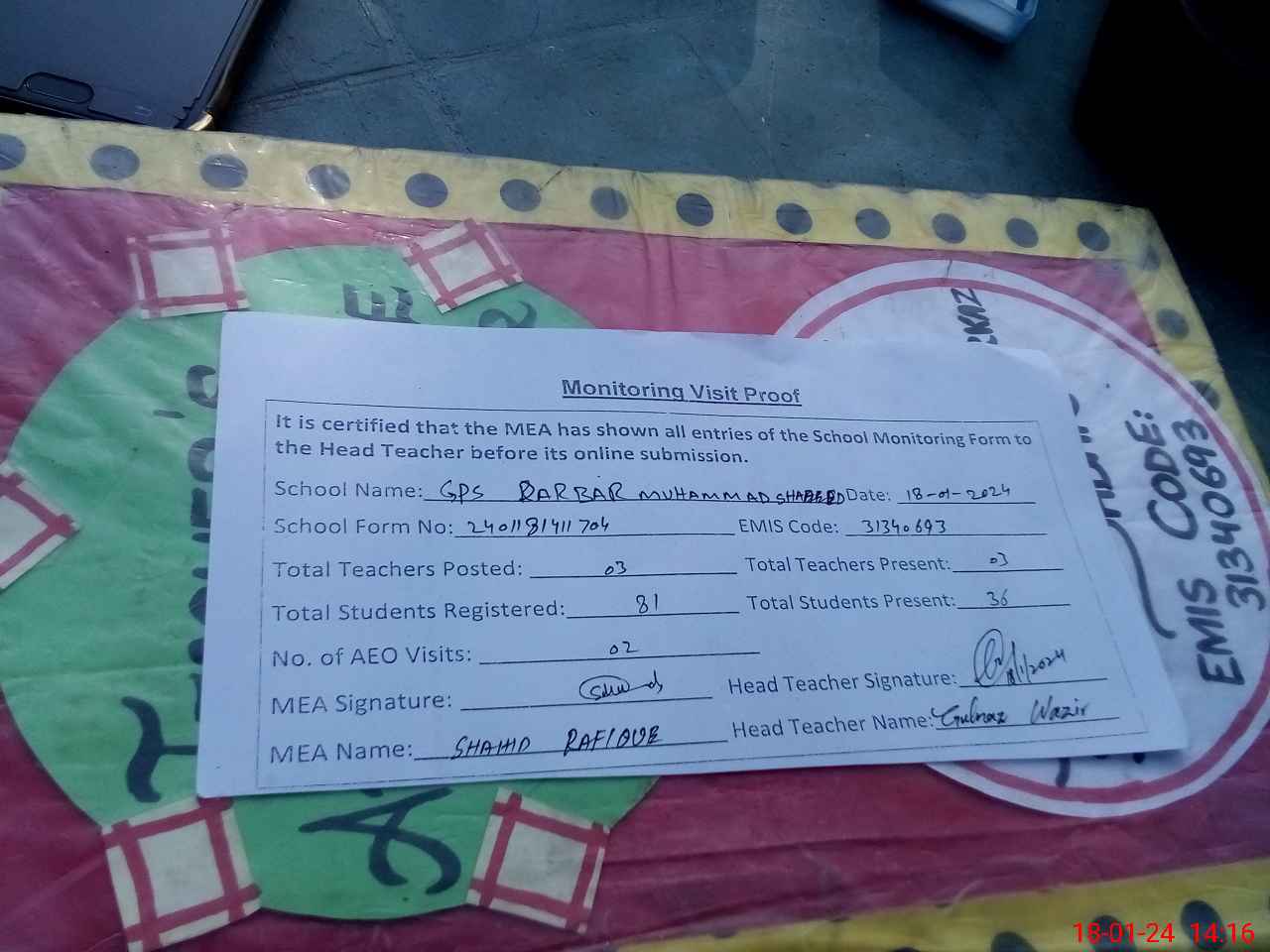 | Attendance Register | Head Teacher | MEA with School | Visit Proof |
