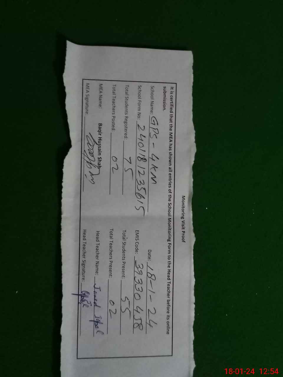 | Attendance Register | Head Teacher | MEA with School | Visit Proof |