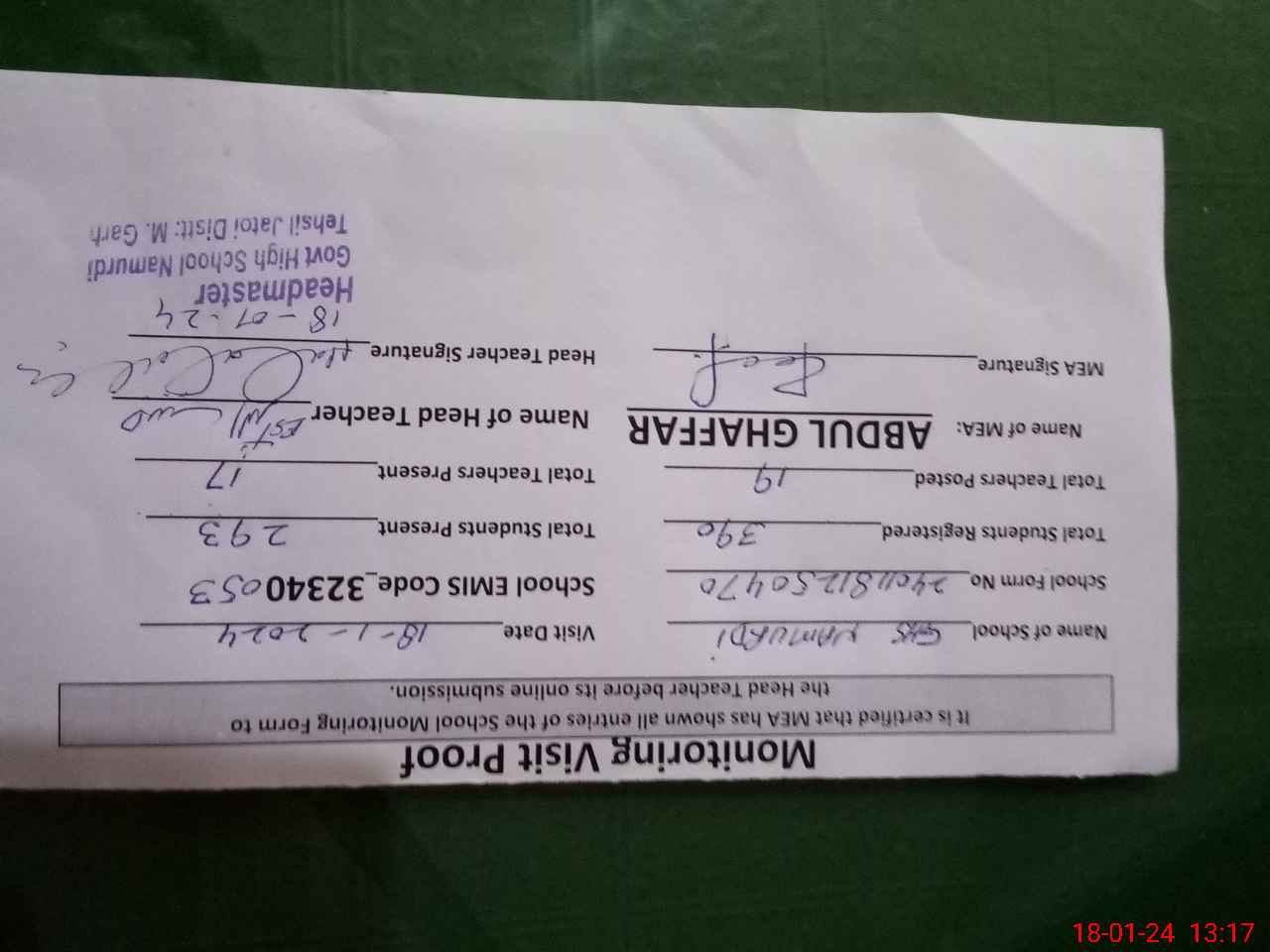 | Certified that this School was Inspected by the Undersigned MEA/DMO Today and the Information Stated Above is as Per Record. | |||||