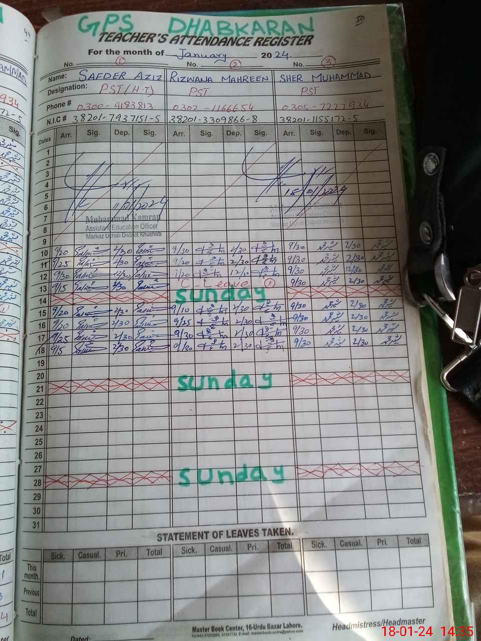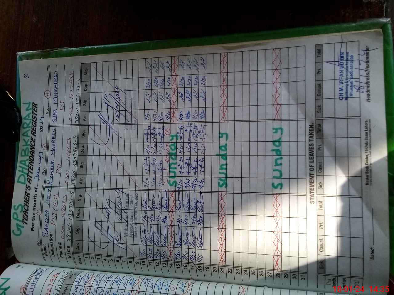 | CNIC | Full Name | Designation | R/C | Absence During Last Calender Month |