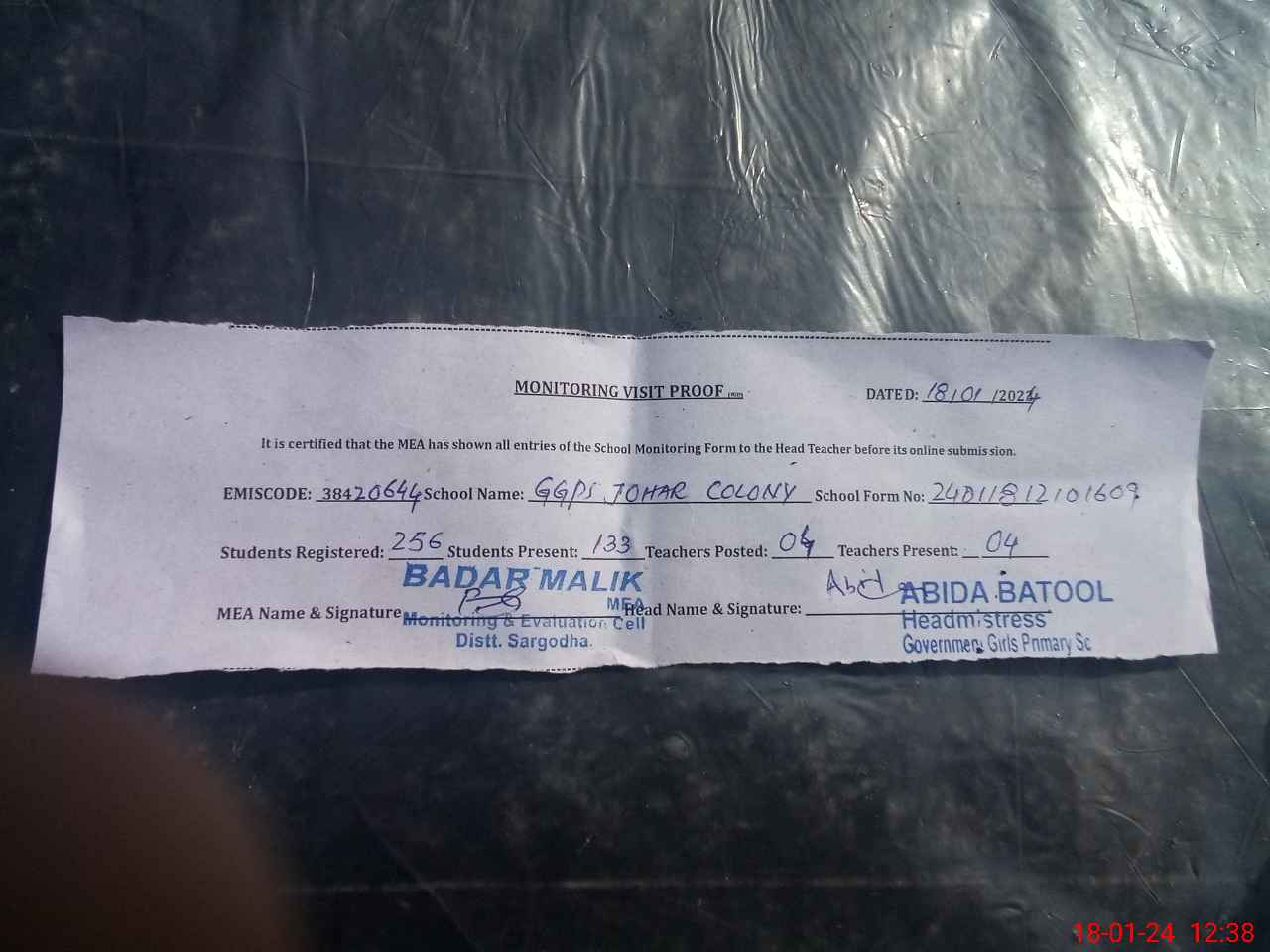 | EMIS Code: 38420644 | Name of School: GGPS JOHAR COLONY SARGODHA | |||