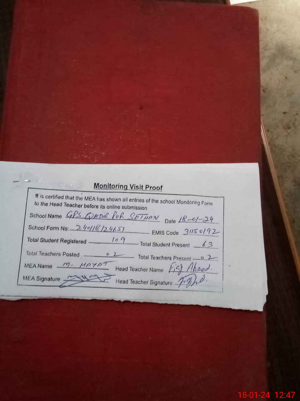| Attendance Register | Head Teacher | MEA with School | Visit Proof |