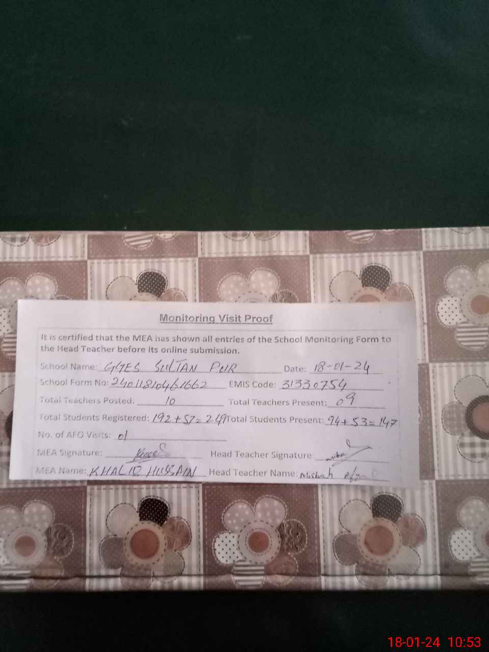 | Attendance Register | Head Teacher | MEA with School | Visit Proof |