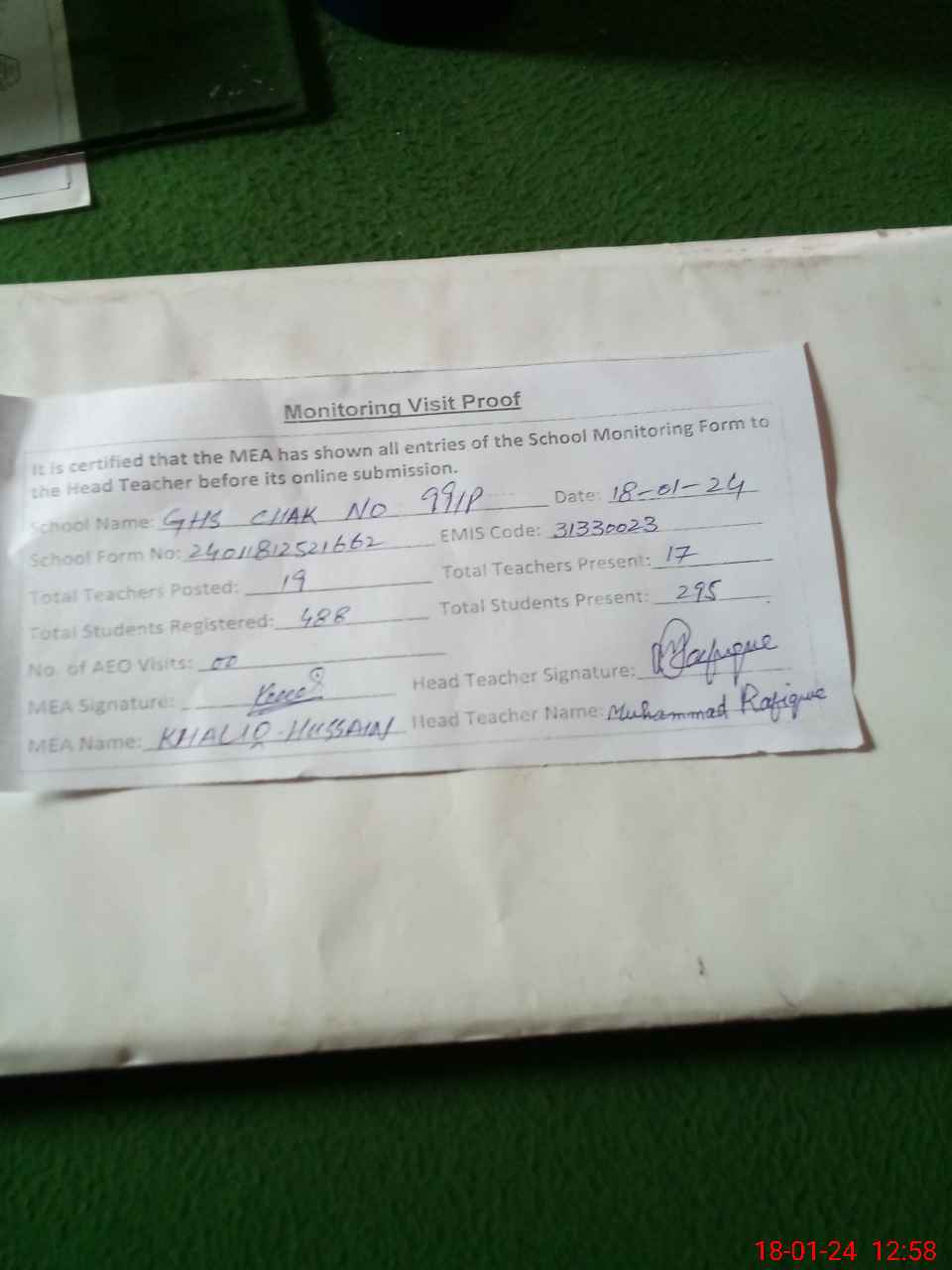 | Attendance Register | Head Teacher | MEA with School | Visit Proof |