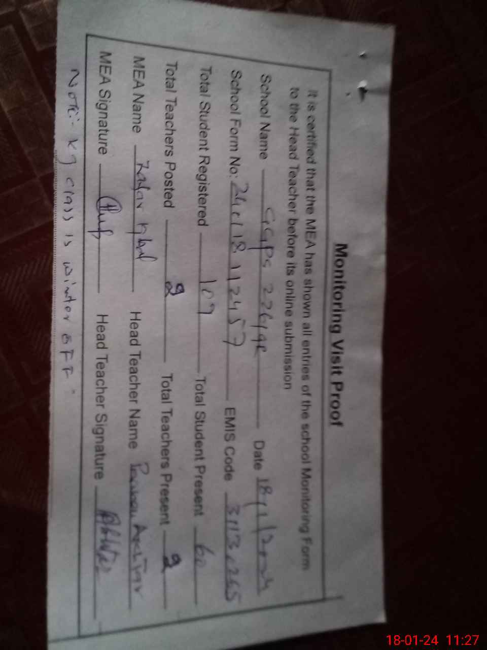 | Attendance Register | Head Teacher | MEA with School | Visit Proof |