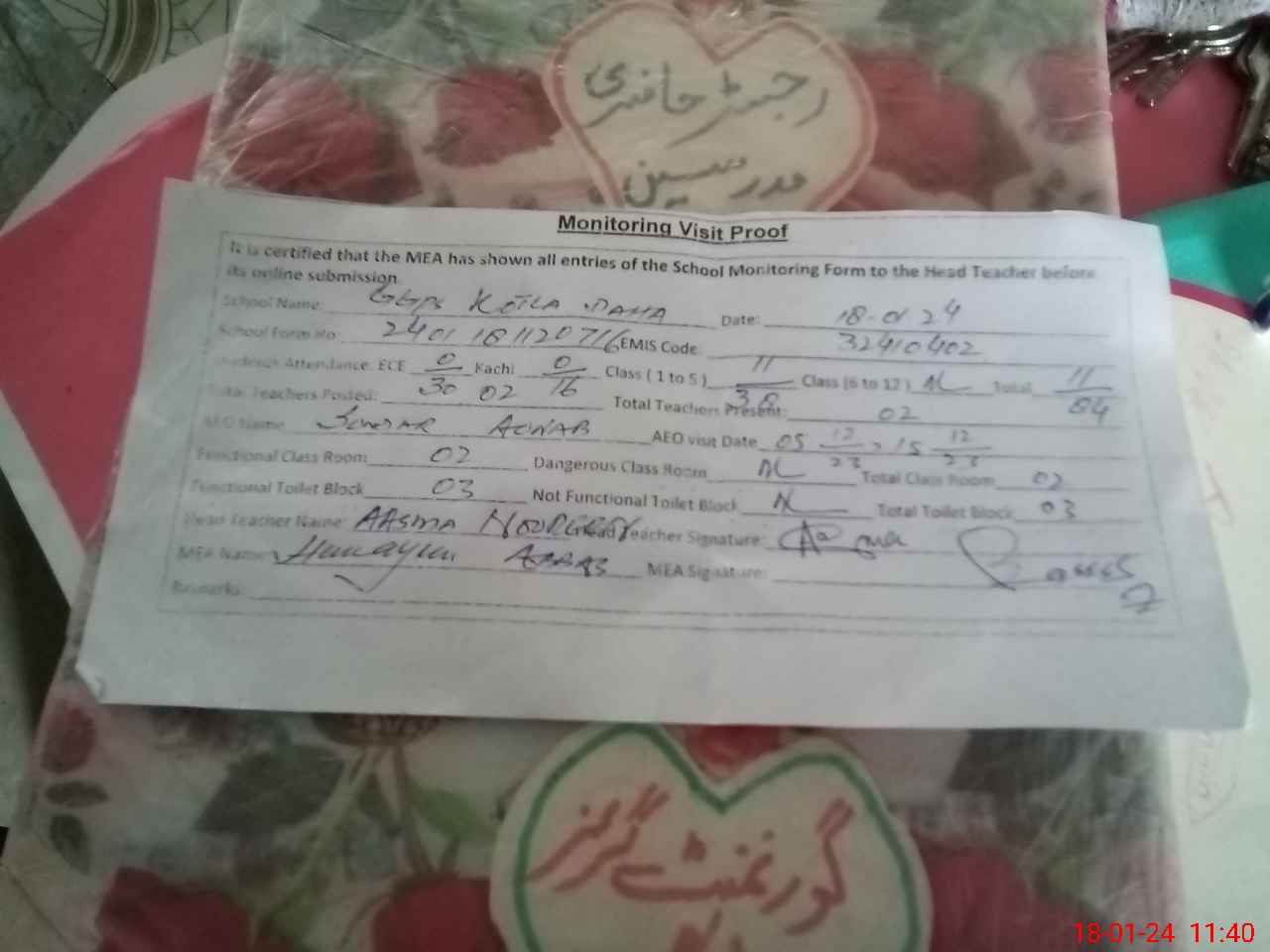 | Attendance Register | Head Teacher | MEA with School | Visit Proof |