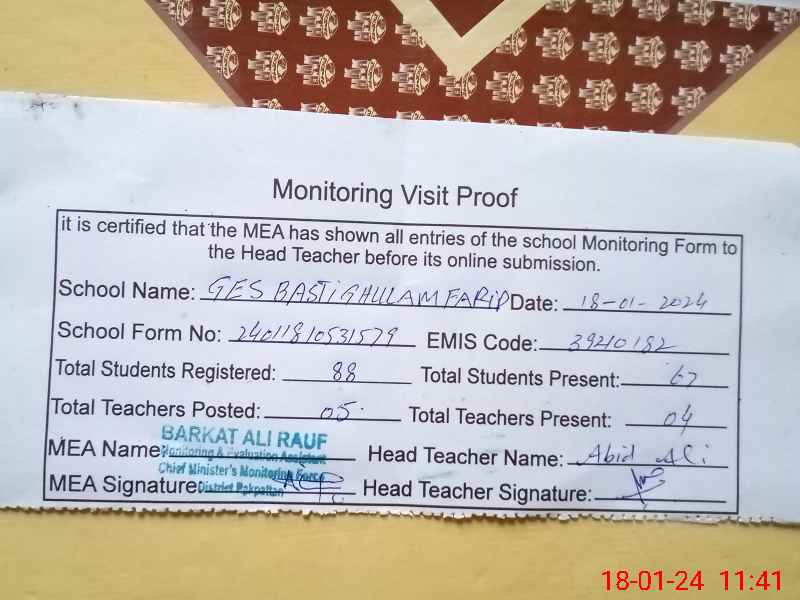 | EMIS Code: 39210182 | Name of School: GES BASTI GHULAM FARID | |||