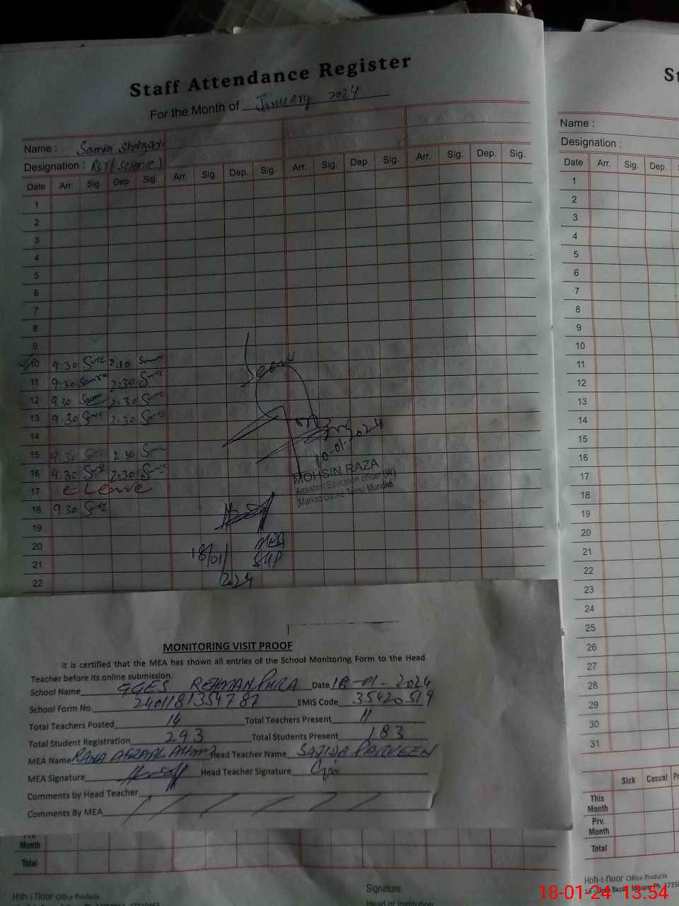 | Attendance Register | Head Teacher | MEA with School | Visit Proof |