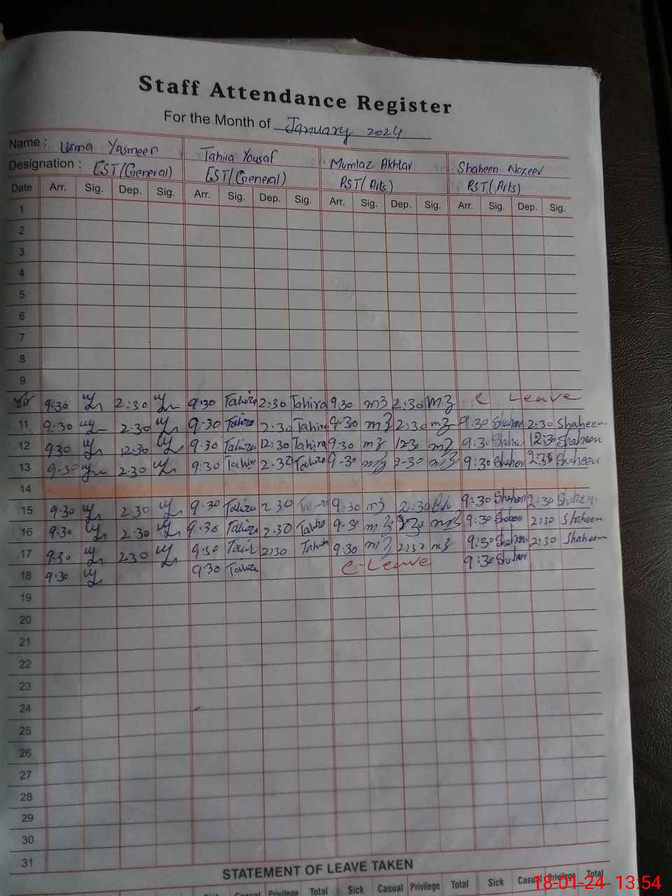 | Leave | Duty | Absent | Maternity | Medical | Ex- Pak |