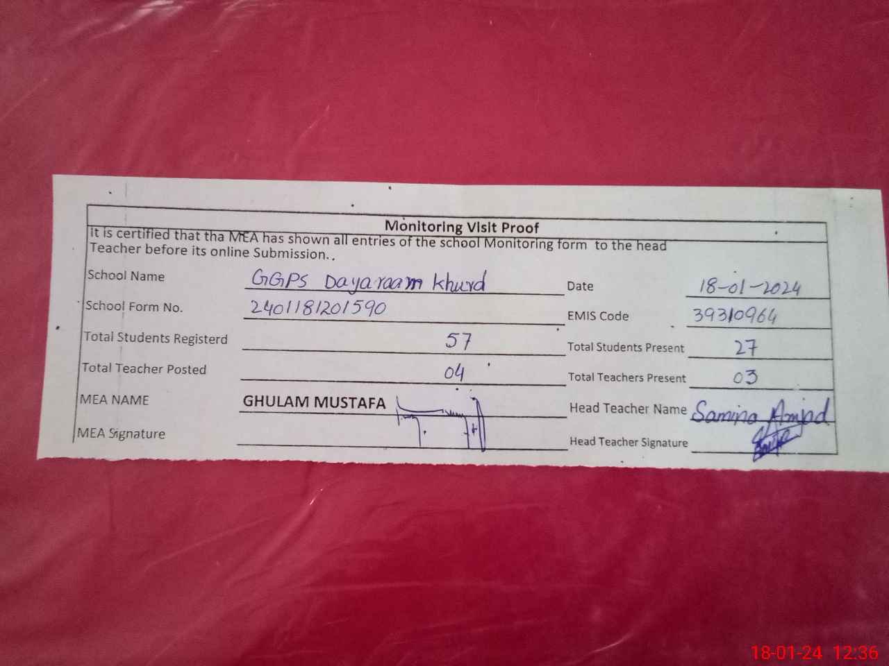 | Attendance Register | Head Teacher | MEA with School | Visit Proof |