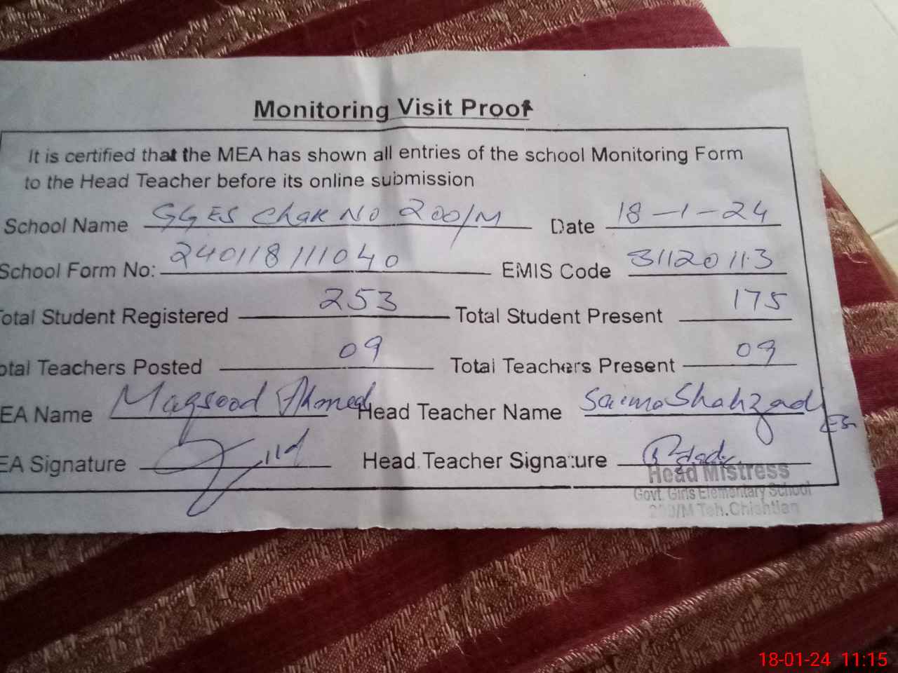 | Attendance Register | Head Teacher | MEA with School | Visit Proof |