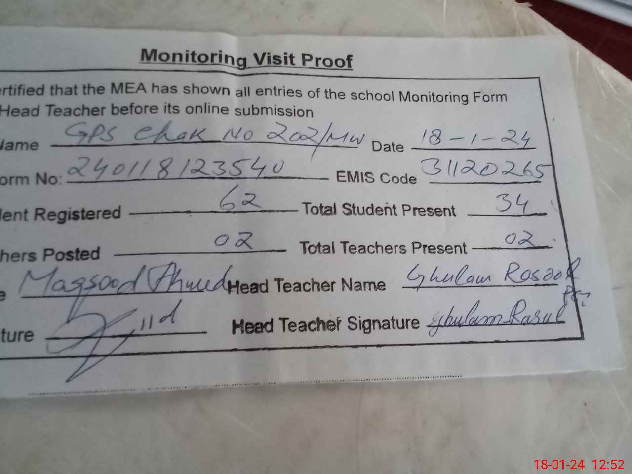 | Attendance Register | Head Teacher | MEA with School | Visit Proof |